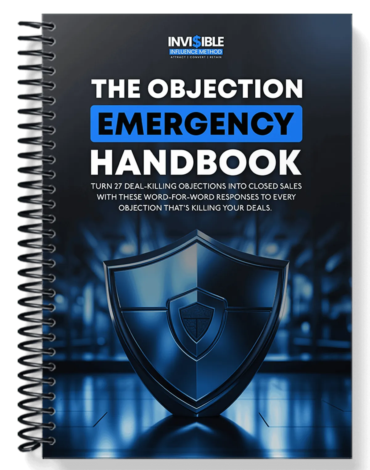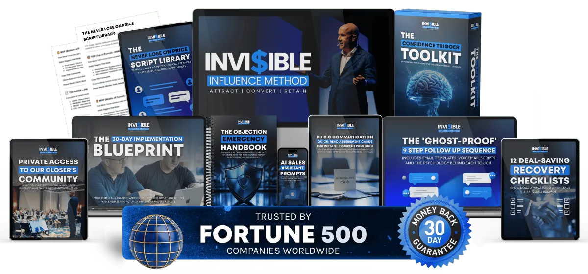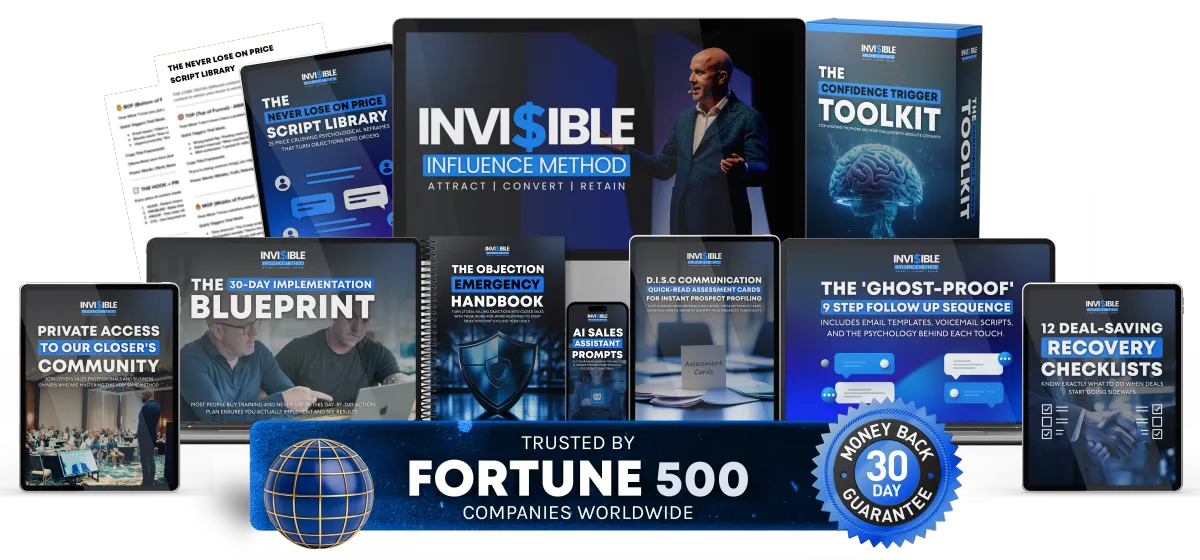 Inside, you'll get access to our complete 9-module video Training that's helped over 10,000 sales professionals Go from 20% to 70% close rates. You'll Learn our 3-phase Invisible Influence Method to ATTRACT perfect prospects who want to buy, CONVERT 7 out of 10 using proven psychology, and RETAIN customers who become your referral engine...