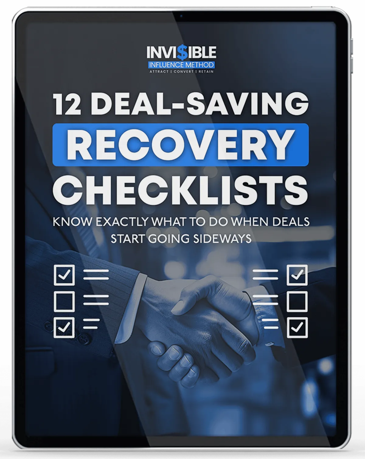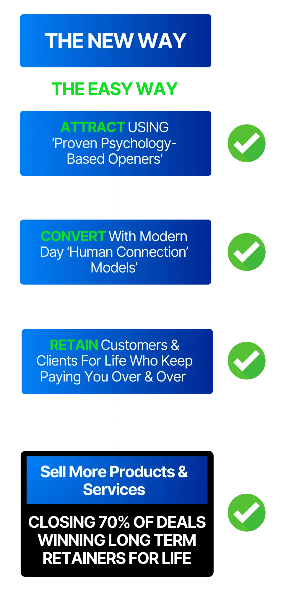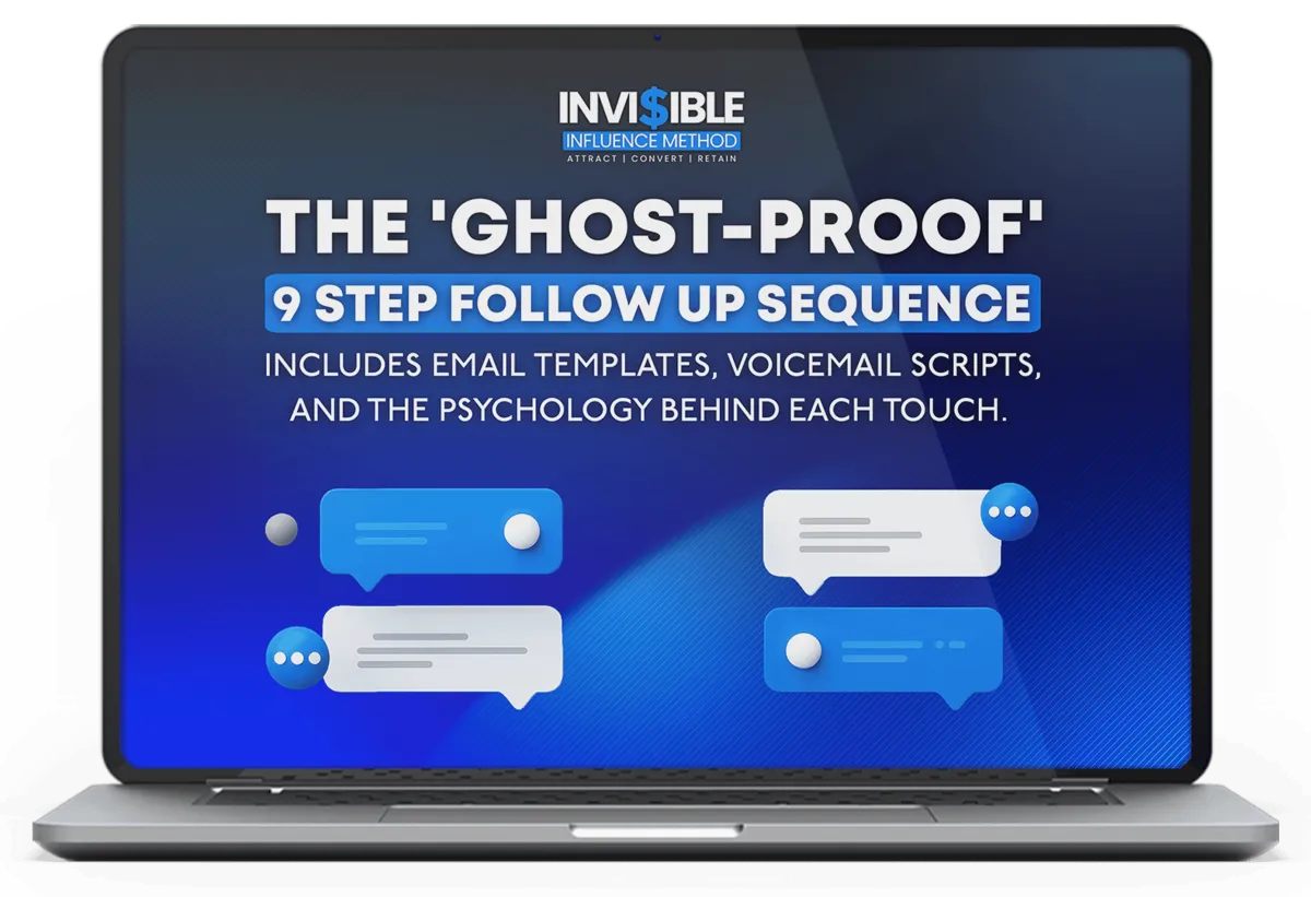 Inside, you'll get access to our complete 9-module video Training and All Our Resources that's helped over 10,000 sales professionals Go from 20% to 70% close rates. You'll Learn our 3-phase Invisible Influence Method to ATTRACT perfect prospects who want to buy, CONVERT 7 out of 10 using proven psychology, and RETAIN customers For Life who become your referral engine...