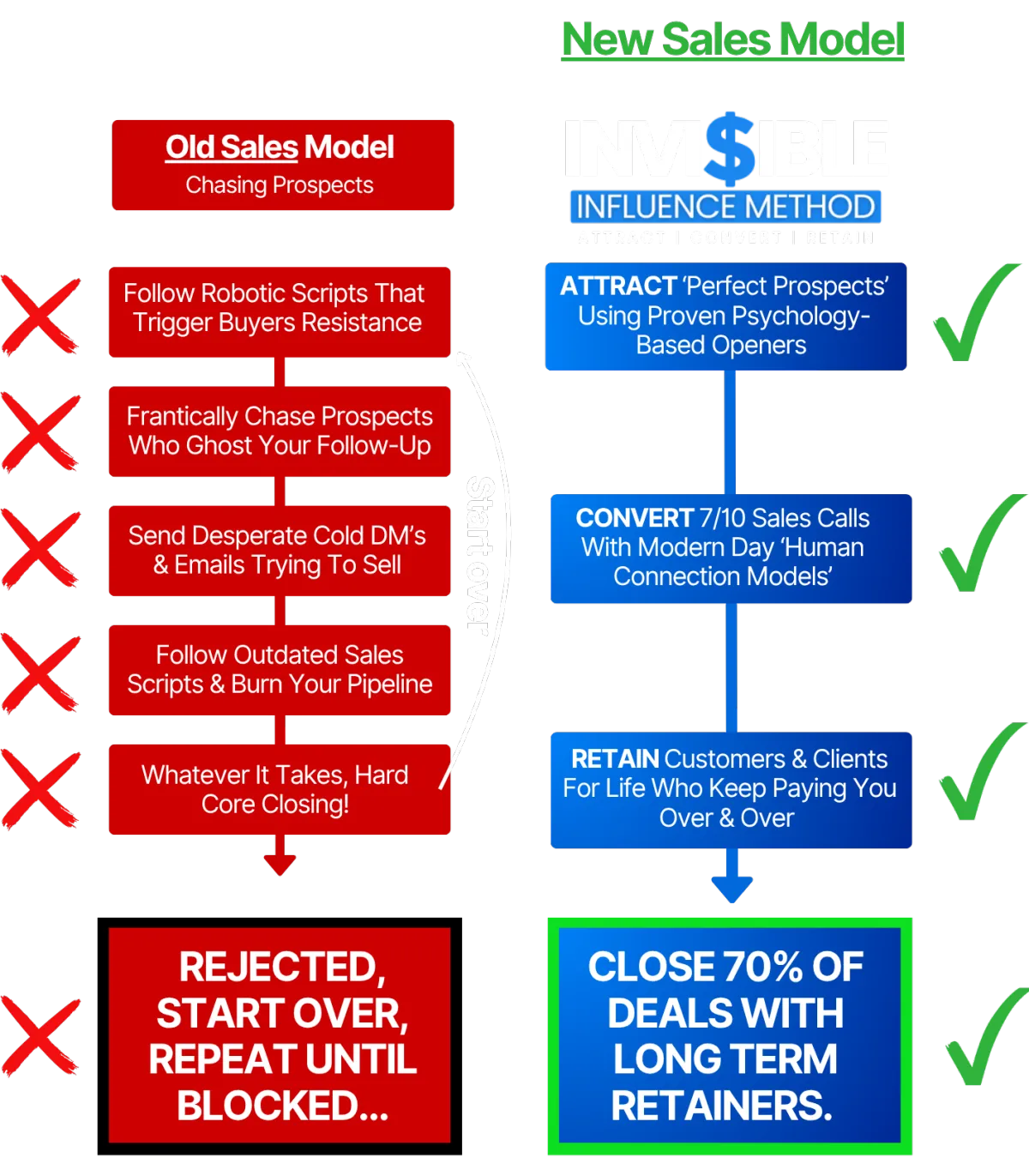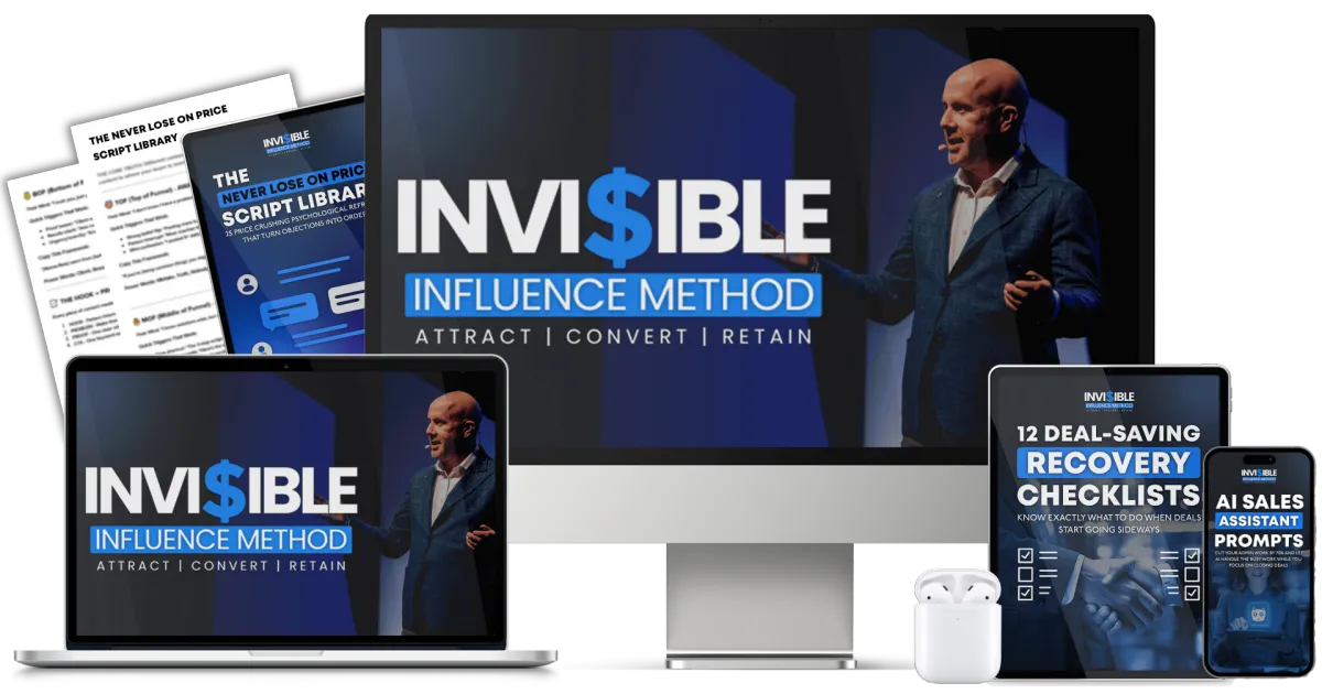 The Invisible Influence Method is a psychology-based selling system that shows you how to ATTRACT the right prospects, CONVERT them at 70%+ close rates, and RETAIN them as customers and clients for life.